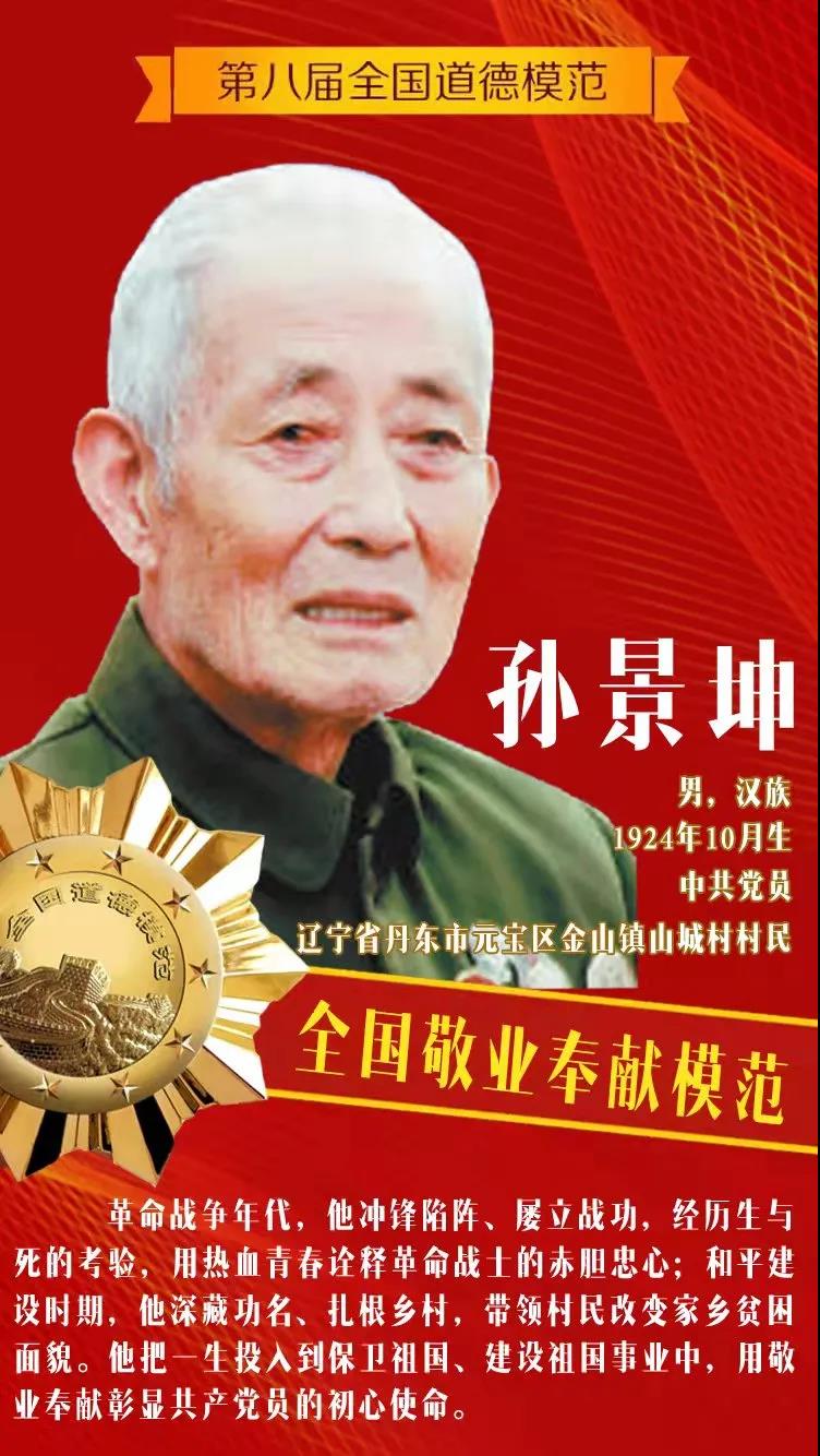 第八届全国道德模范孙景坤,在革命战争年代,冲锋陷阵、屡立战功;在和平建设时期,深藏功名、扎根乡村。他把一生都投入到保卫祖国、建设祖国事业中,用敬业奉献引领了时代的道德风尚。